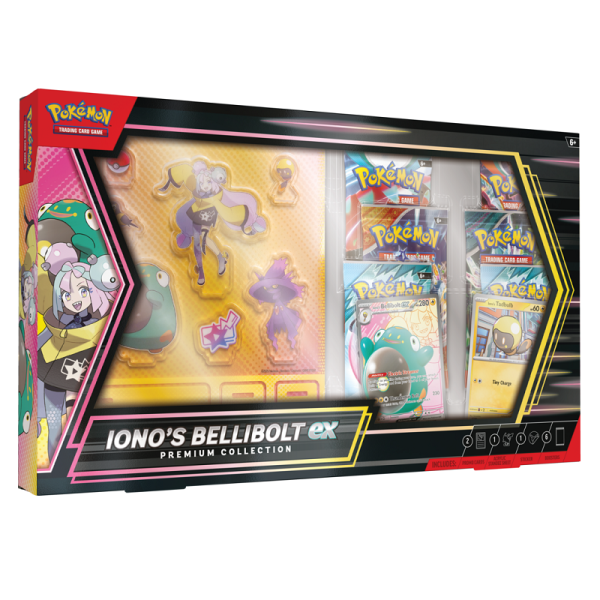 La Líder de Gimnasio de Levincia, Iono, junto a su compañero, el Pokémon Bellibolt, ¡forman un equipo inseparable y lleno de energía! Con esta colección, puedes invocar a Bellibolt ex de Iono con su habilidad Electric Streamer, para cargar a los demás Pokémon de Iono en tu equipo. Además, disfruta de la diversión electrizante con figuras acrílicas, una colorida pegatina y varios sobres de mejora del JCC Pokémon. La Colección Premium Pokémon TCG: Bellibolt ex de Iono incluye: